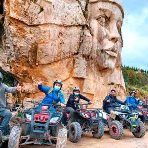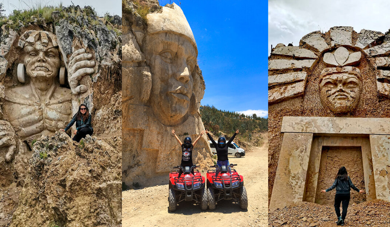 La ruta en cuatrimotos tiene la duración de 45 minutos y de 30 minutos de visita la MORADA DE LOS DIOSES, para poder apreciar las diversas esculturas hechas a mano, apreciando el paisaje natural y poder tomarse fotos.
