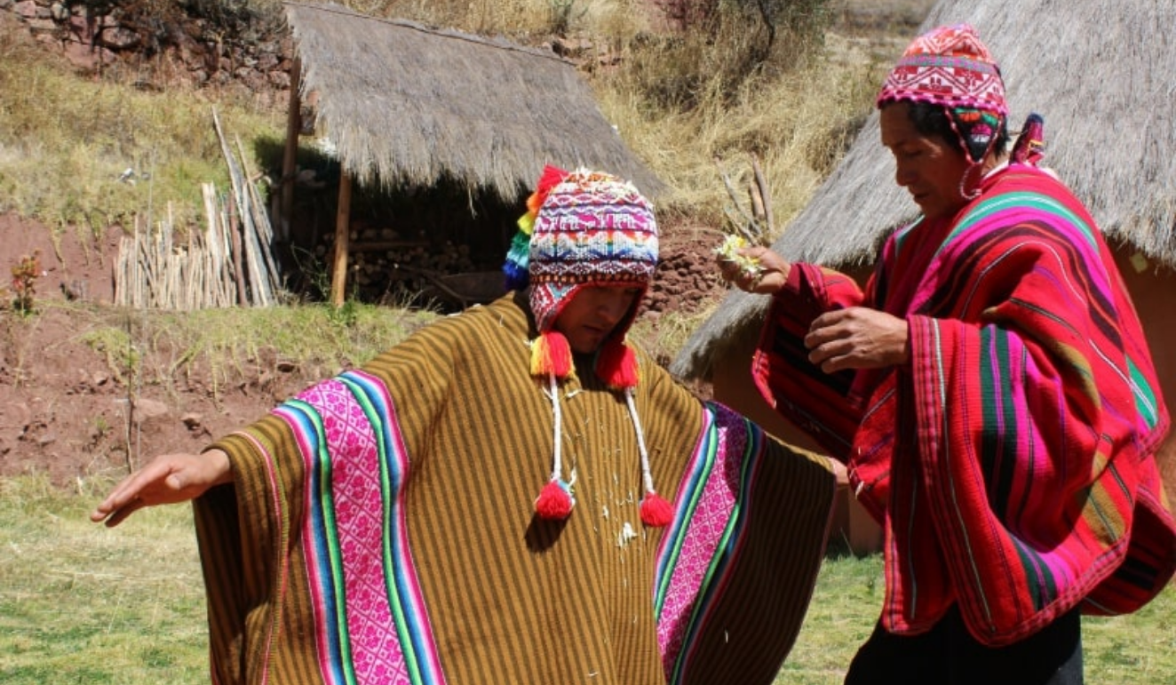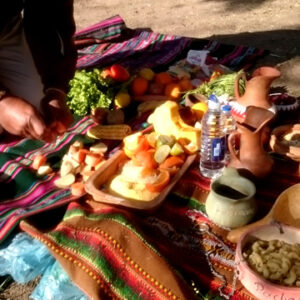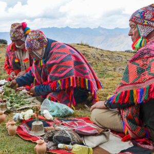El sacerdote andino o Paqo ofrece los elementos, empezando por las hojas de coca, luego las comidas y bebidas.