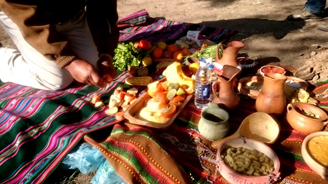 El sacerdote andino o Paqo ofrece los elementos, empezando por las hojas de coca, luego las comidas y bebidas.