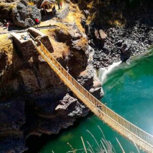 Una vez que tenga las primeras vistas del Puente Inca, comenzaremos a descender las graderías o escalinatas antes de llegar al lugar en donde se encuentra el mismo Puente. Allí tendremos un tiempo para explorar y cruzar el Puente Inca de Q’eswachaka, luego de haber sentido la adrenalina y de cruzar el puente, su guía les narrará la de esta obra de ingeniería Inca, el proceso de construcción y cuidado del Puente.
